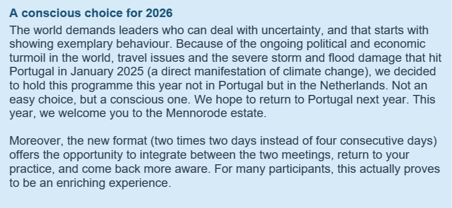 In four intensive days you discover what authentic leadership really means to you. You break through limiting patterns and discover how to face the future with clarity and confidence. This programme takes you out of your daily context and invites you to take a systemic look at yourself, your environment and your role as leader. Within a small, close-knit group of a maximum of 12 participants, you will work on your personal and professional development, with an eye for the deeper dynamics that influence your leadership.